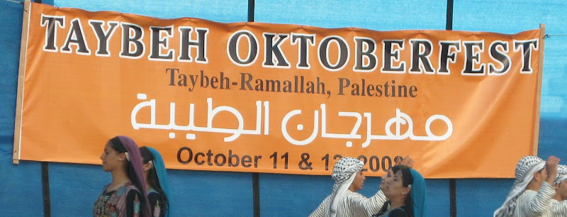 Wir (Faryal, Liam, Bea, Sebastian, Ich) sind am Samstag so um 11 Uhr los getrampt und waren so ca. 2 Stunden später in Taybeh. Bei den ersten Bieren haben wir uns dann auf der Bühne abwechselnd arabische Tänze und bayrische Blasmusik (es war ne Gruppe aus Bayern, in bayrischer Tracht da) angesehen.